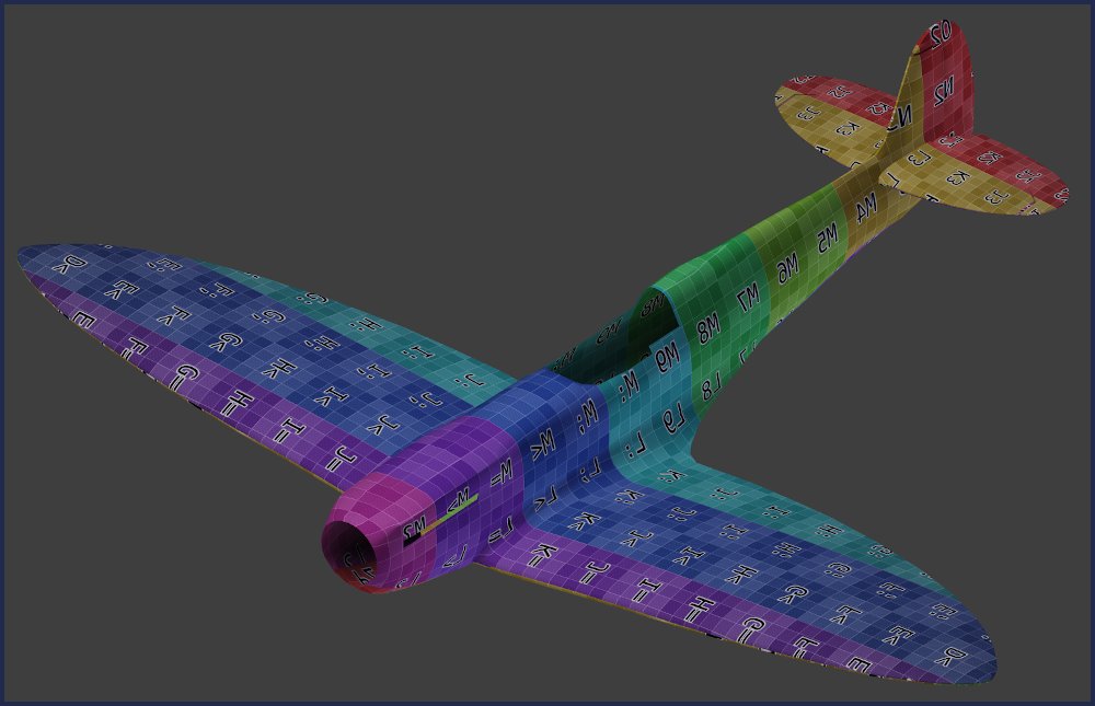 With my goal for the project achieved I decided to add to the project and create a full skin for the spitfire. With the skin created it was UV unwrapped and a 2D image of the skin created. This was checked for for any stretched areas of the UV layout using Blenders colour UV grid.